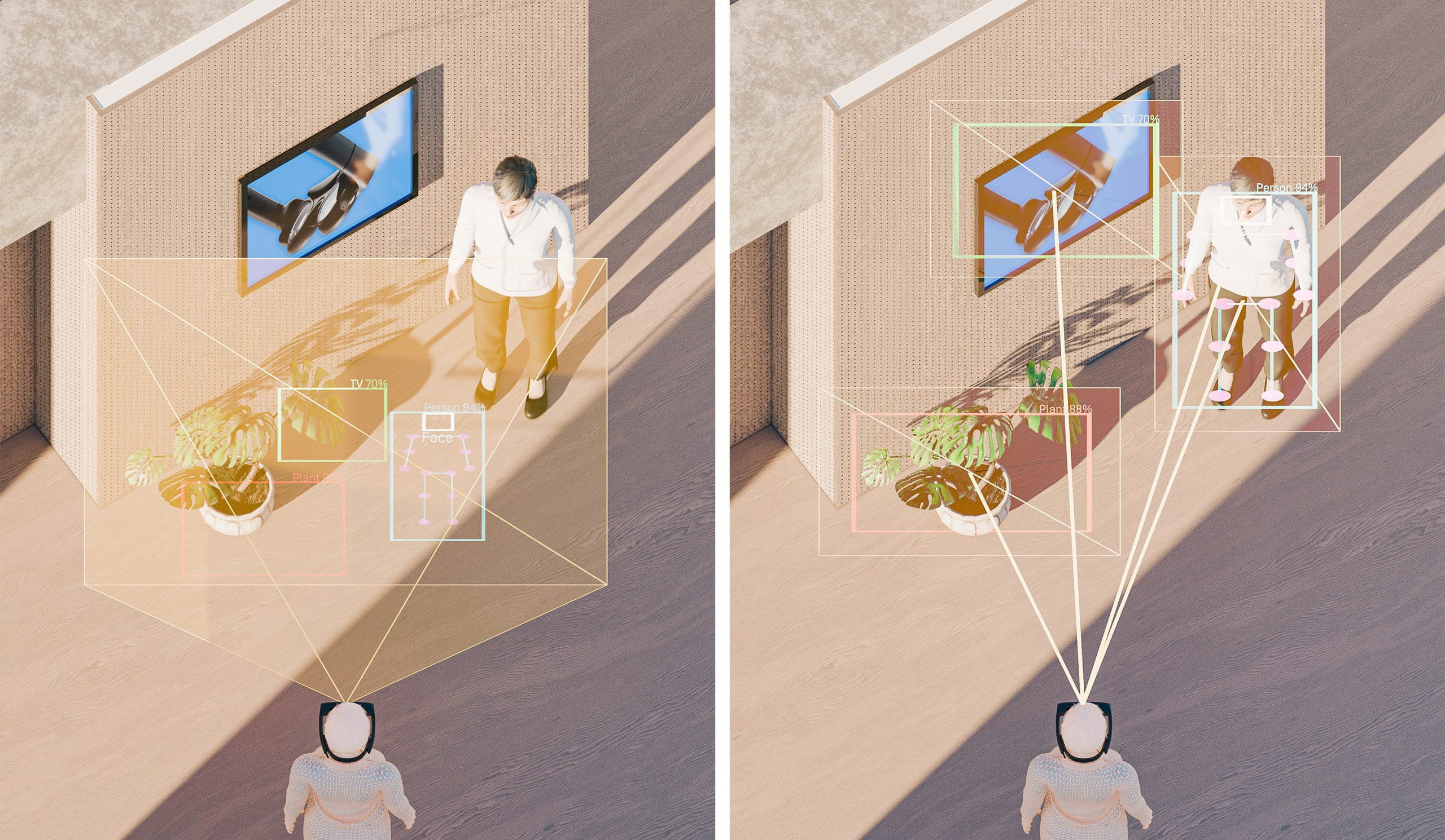 これにより、アプリケーションは物理環境と意味的に連動する表現を可能とする。たとえば、仮想コンテンツを検出された物体に動的にアンカーしたり、ナビゲーションシステムをシーンコンテキストに応じて変化させたり、環境の認識結果に基づいてアプリケーション挙動を制御することが可能となる。本手法では推論処理を外部化することで、ヘッドセット単体では不可能なモデルの複雑性や更新頻度にも対応できる。