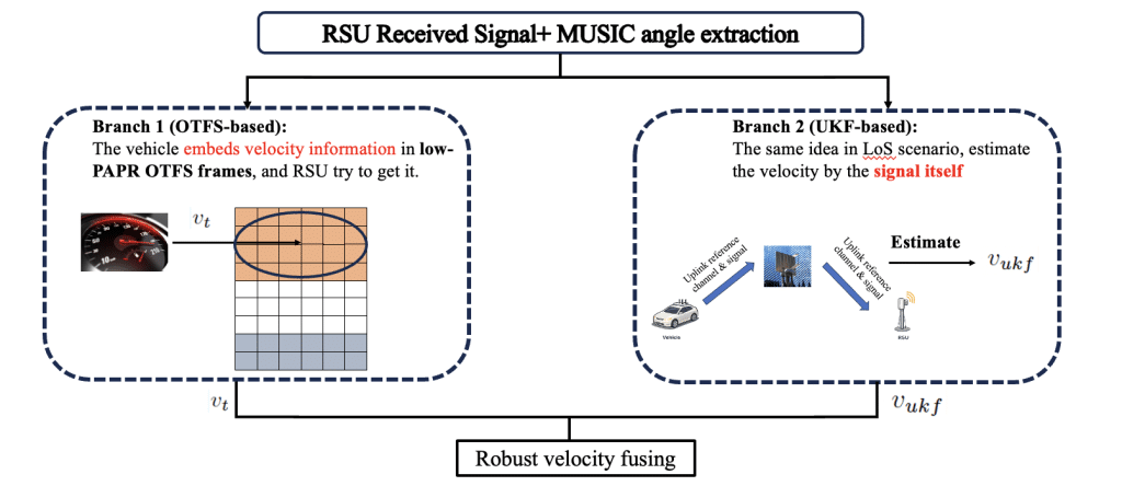 abstract = {This paper proposes a novel and robust framework for velocity and position estimation in vehicle-to-everything (V2X) communication networks, targeting challenges that arise when traditional GPS systems and line-of-sight (LoS) channels fail due to signal blockages between vehicles, base stations (BSs), and satellites. The proposed solution integrates multiple complementary methods to enhance robustness and accuracy. Specifically, the framework first applies the MUSIC algorithm for angle-of-arrival (AoA) estimation to obtain reliable initial positioning. In parallel, a newly designed low peak-to-average power ratio (PAPR) frame structure is introduced under reconfigurable intelligent surface (RIS)-assisted Orthogonal Time Frequency Space (OTFS) modulation, enabling resilient velocity embedding against noise and interference. These methods jointly support an unscented Kalman Filter (UKF), which refines the velocity and position estimation with high reliability. Extensive numerical evaluations confirm the effectiveness of the proposed multi-method integrated framework. Various modulation techniques, including zero padding (ZP), cyclic prefix (CP), and their recursive variants (e.g., RZP, RCP), demonstrate improved bit error rate (BER) performance over traditional OFDM. The proposed low-PAPR signal design achieves a 21.5% PAPR reduction compared to conventional embedded pilot schemes, significantly improving BER in 4-QAM scenarios. Velocity estimation results also show that the UKF outperforms the extended Kalman Filter (EKF) in both straight and curved road conditions. By combining MUSIC-based AoA estimation with RIS assistance under NLoS conditions, the proposed framework remains effective even in high-Doppler and low-SNR environments.},
