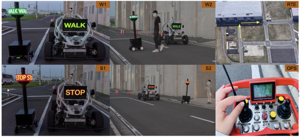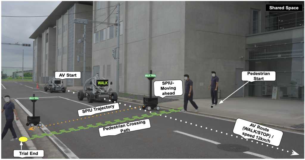 Recent progress has extended the project beyond conceptual and lab-based studies into cross-cultural and real-world evaluation. In a VR-AWSIM framework developed in Japan and replicated in Norway, SPIU improved pedestrian decision-making across high-risk situations such as four-way intersections, blindspots, mixed traffic with delivery robots, and nighttime crossings. Most recently, a mobile SPIU prototype was built and evaluated in an outdoor shared-space study, where SPIU improved understandability, trust, and perceived safety, with the strongest results observed when SPIU and vehicle eHMI were used together. Together with related work on shared-space visual design, these studies position SPIU as a practical infrastructure-side interface for future pedestrian-AV ecosystems and point toward richer multimodal, accessible, and deployable communication in real cities.