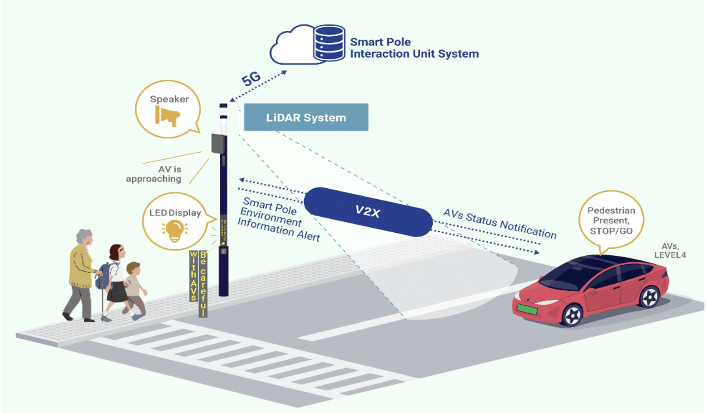 As autonomous vehicles move into pedestrian-centered urban spaces, communication becomes as important as perception and control. In shared spaces, pedestrians, cyclists, and vehicles negotiate movement informally, often without strong lane separation or conventional traffic signals. Once the human driver disappears, pedestrians lose the social cues they normally rely on, such as eye contact, gestures, and informal yielding behavior. This project addresses that communication gap through the Smart Pole Interaction Unit (SPIU), an infrastructure-side interface that works alongside vehicle-mounted eHMIs to provide synchronized pedestrian-facing signals near the point of interaction.
