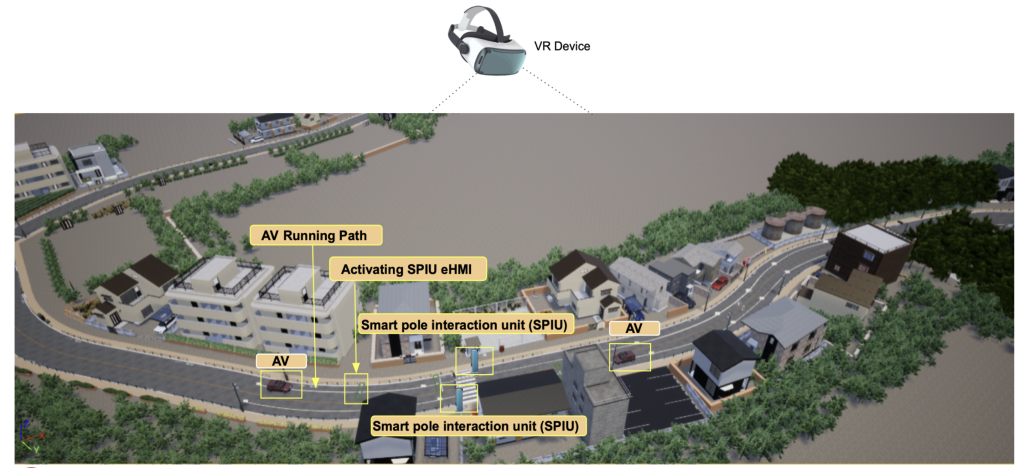 abstract = {As autonomous vehicles (AVs) enter pedestrian-centric environments, existing vehicle-mounted external human–machine interfaces (eHMIs) often fall short in shared spaces due to line-of-sight limitations, inconsistent signaling, and increased cognitive burden on pedestrians. To address these challenges, we introduce the Smart Pole Interaction Unit (SPIU), an infrastructure-based eHMI that decouples intent signaling from vehicles and provides context-aware, elevated visual cues. We evaluate SPIU using immersive VR-AWSIM simulations in four high-risk urban scenarios: four-way intersections, autonomous mixed traffic, blindspots, and nighttime crosswalks. The experiment was developed in Japan and replicated in Norway, where forty participants engaged in 32 trials each under both SPIU-present and SPIU-absent conditions. Behavioral (response time) and subjective (acceptance scale) data were collected. Results show that SPIU significantly improves pedestrian decision-making, with reductions ranging from 40% to over 80% depending on scenario and cultural context, particularly in complex or low-visibility scenarios. Cross-cultural analyses highlight SPIU's adaptability across differing urban and social contexts. We release our open-source Smartpole-VR-AWSIM framework to support reproducibility and global advancement of infrastructure-based eHMI research through reproducible and immersive behavioral studies.},